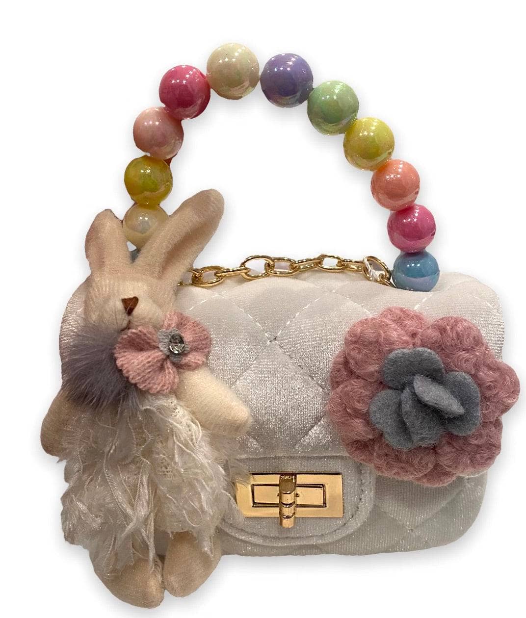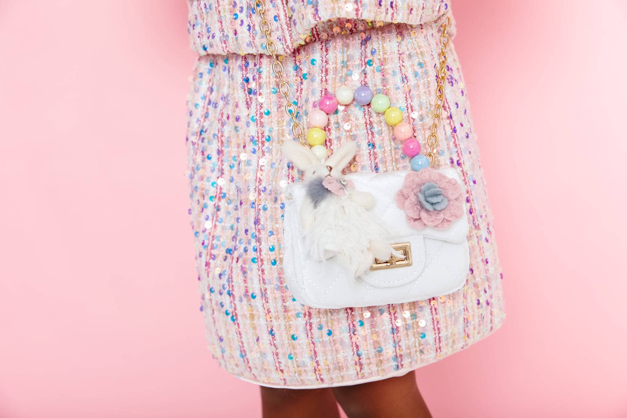 • Glamorous mini purse featuring a glittery velour bunny charm with a jewel-studded belly.