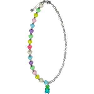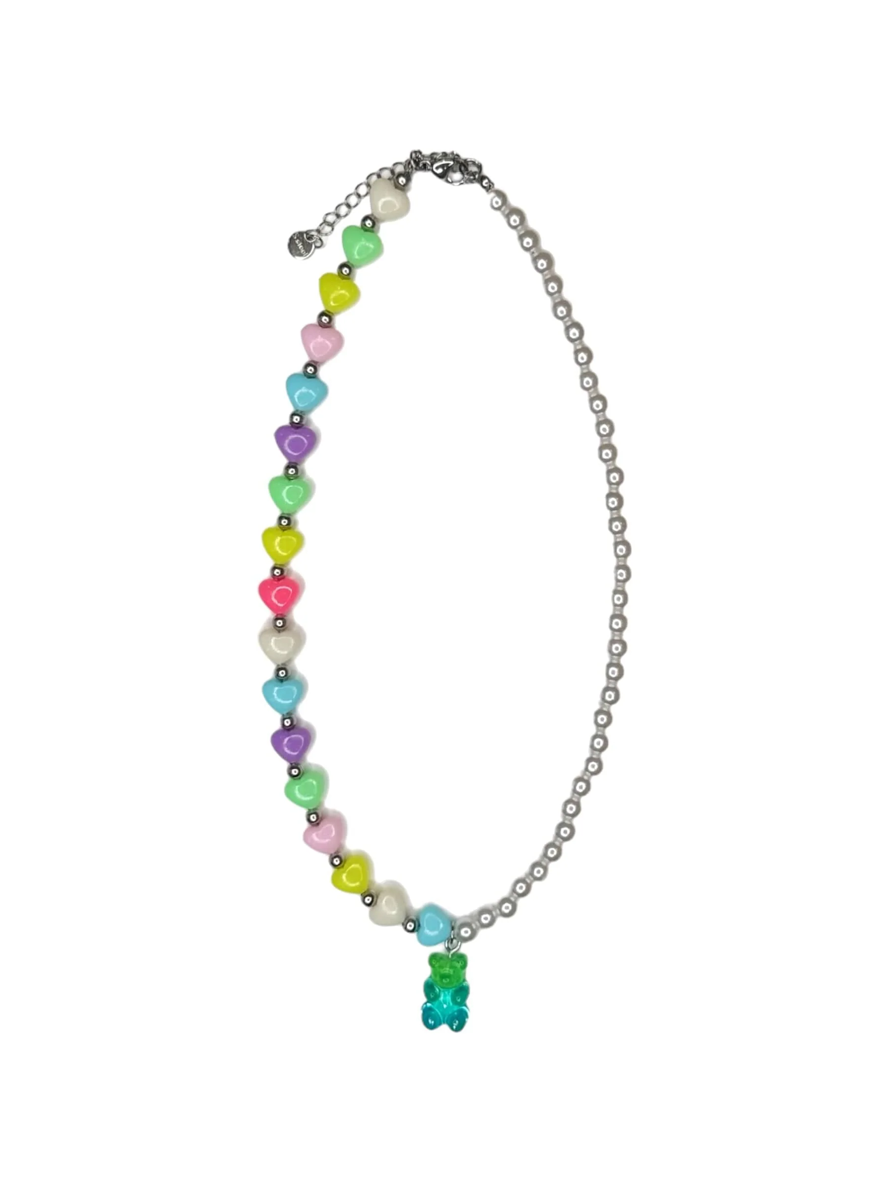 - Add a playful charm to your accessory collection with this whimsical necklace featuring vibrant candy-colored heart beads paired with a dazzling green bear pendant, perfect for making a bold fashion statement.