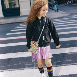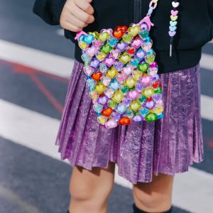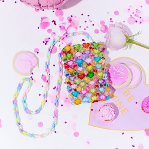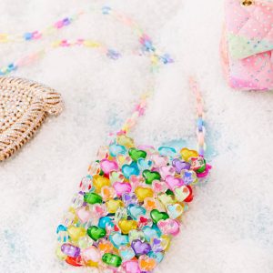 • The crossbody bag features a unique design with colorful heart-shaped beads, creating a fun and eye-catching look.