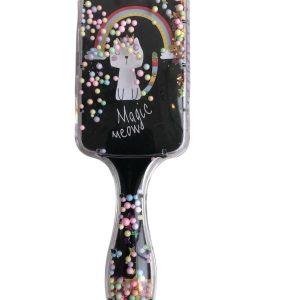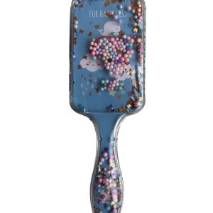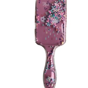 - Magical detangling brush filled with floating confetti, beads, and glitter for extra styling sparkle.