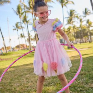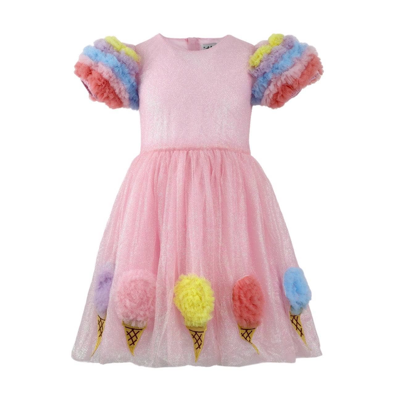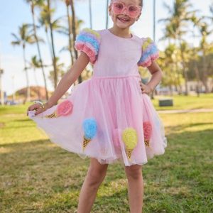 - Step into a whimsical world with this enchanting dress, adorned with fluffy ice cream cone appliqués that bring a playful touch to its delicate pink shimmer.