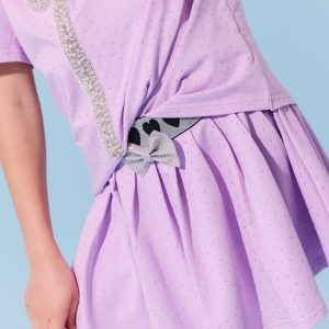 - Includes a short-sleeve top with a statement bow and a matching flared skirt with a heart-detailed waistband.