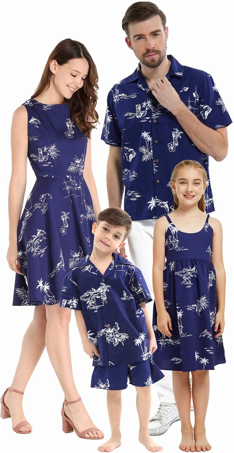 Matchable Family Hawaiian Luau Men Women Girl Boy Clothes in Classic Map Flamingo Navy
