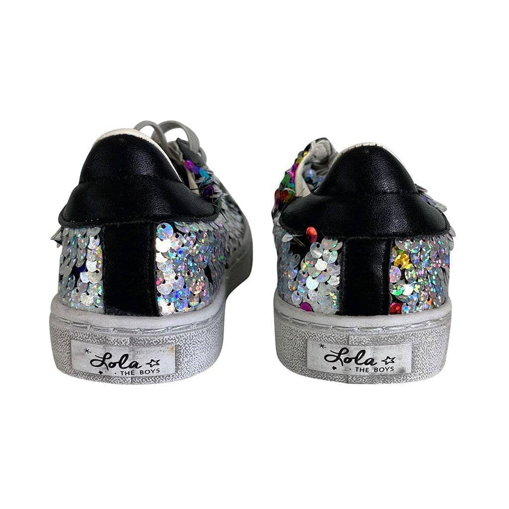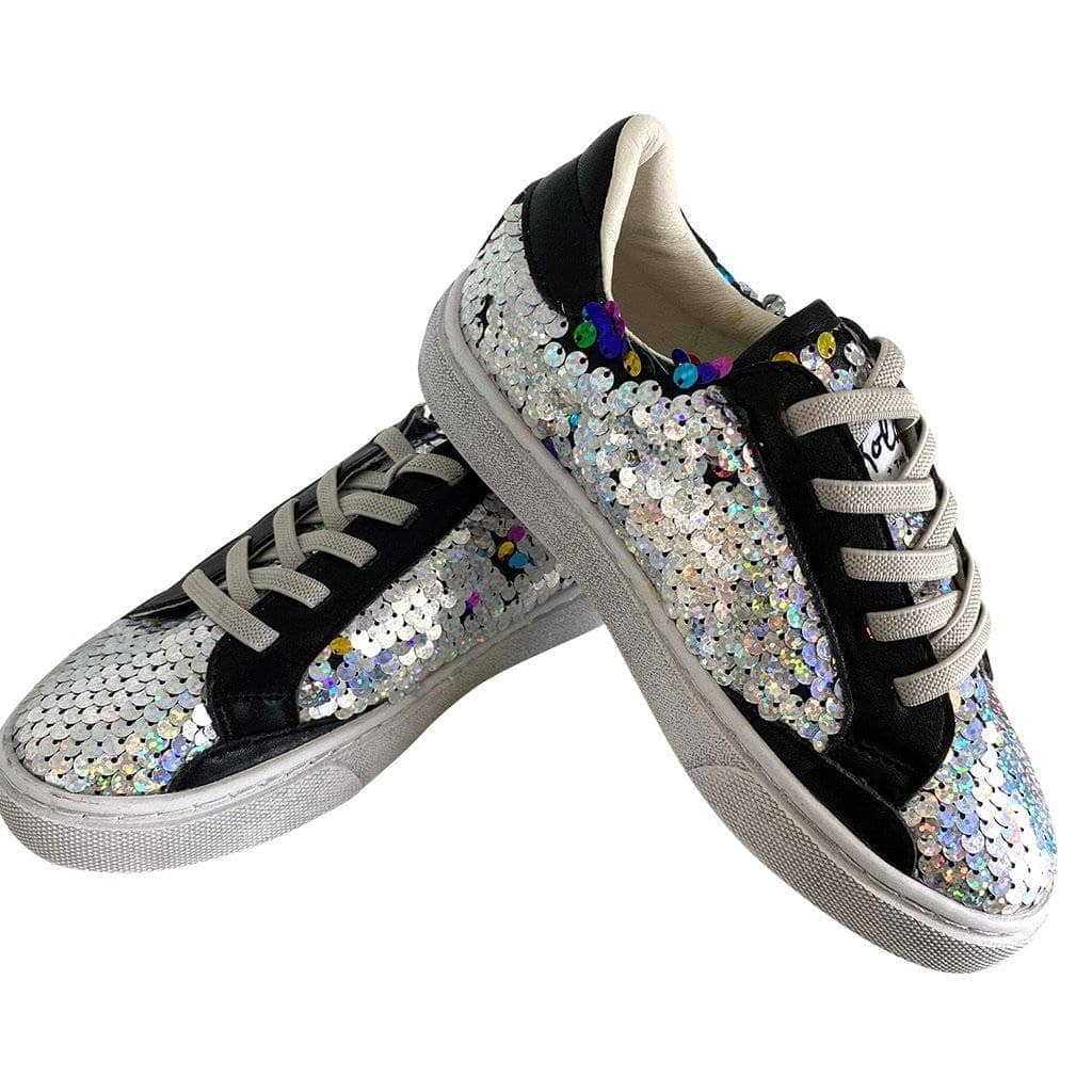 • Dazzling sneakers adorned with midnight silver sequins that catch the light with every step.