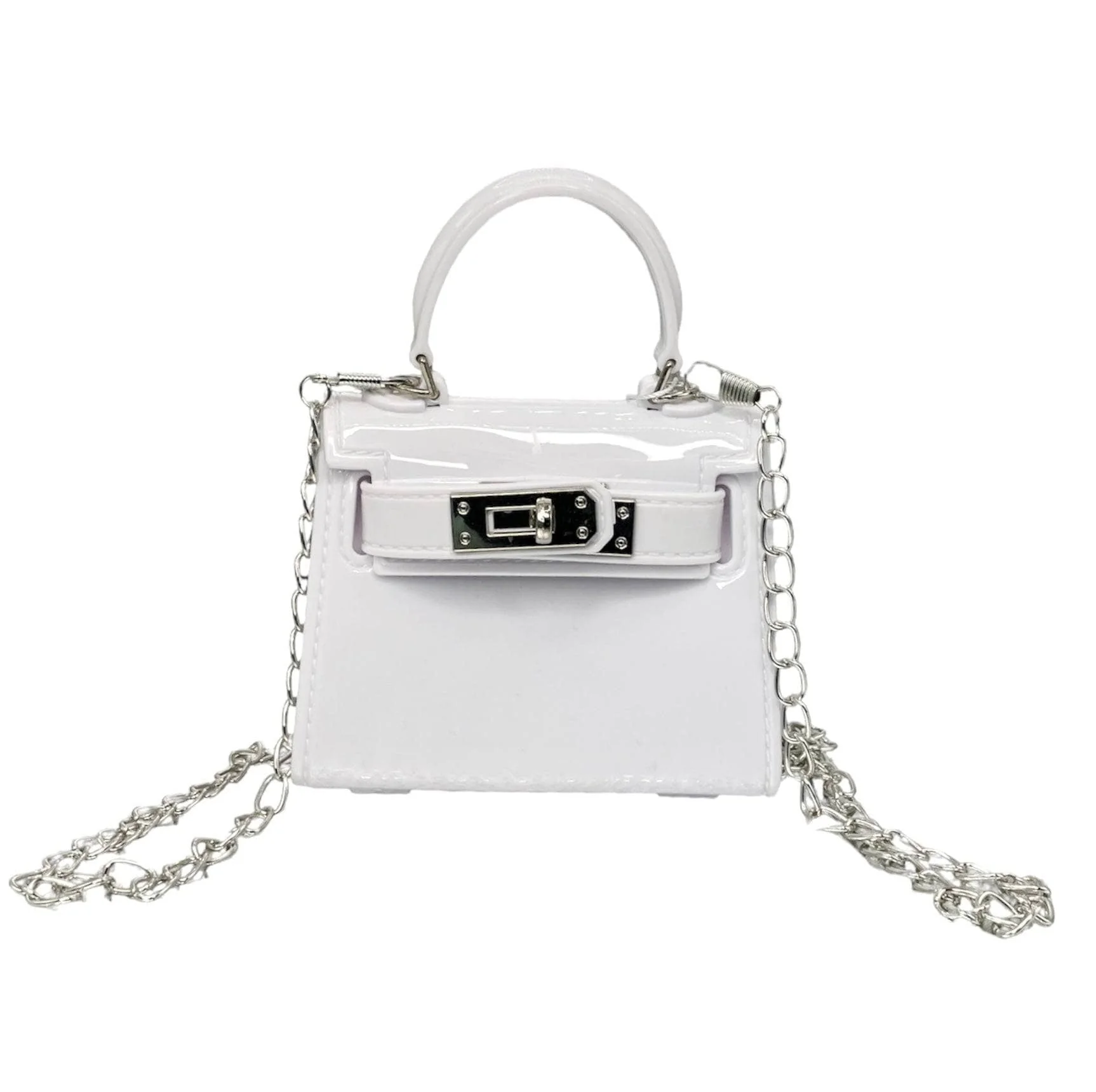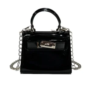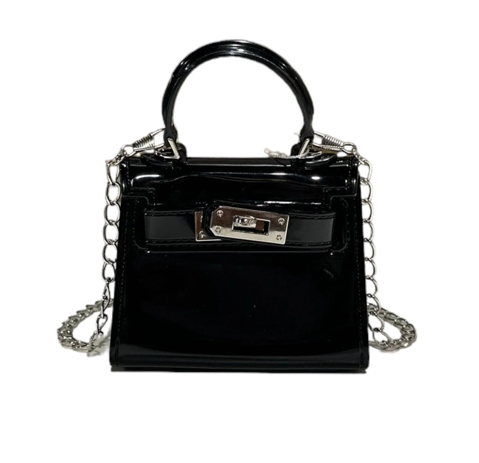 - Features a top handle, turn-lock closure, and an optional crossbody chain for versatile styling.