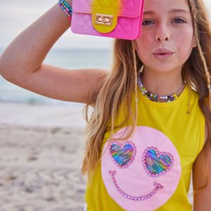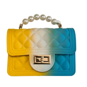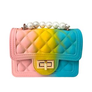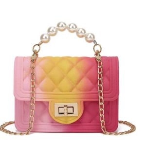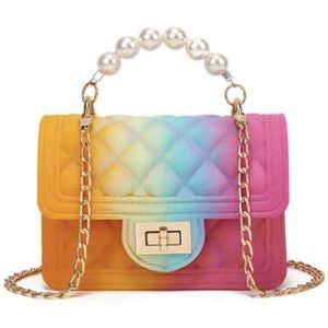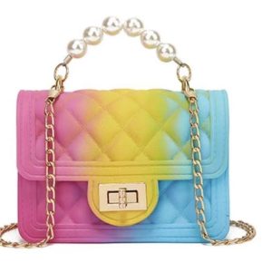 - Luxe mini purse in a dreamy tie-dye gradient of pink, yellow, and blue.