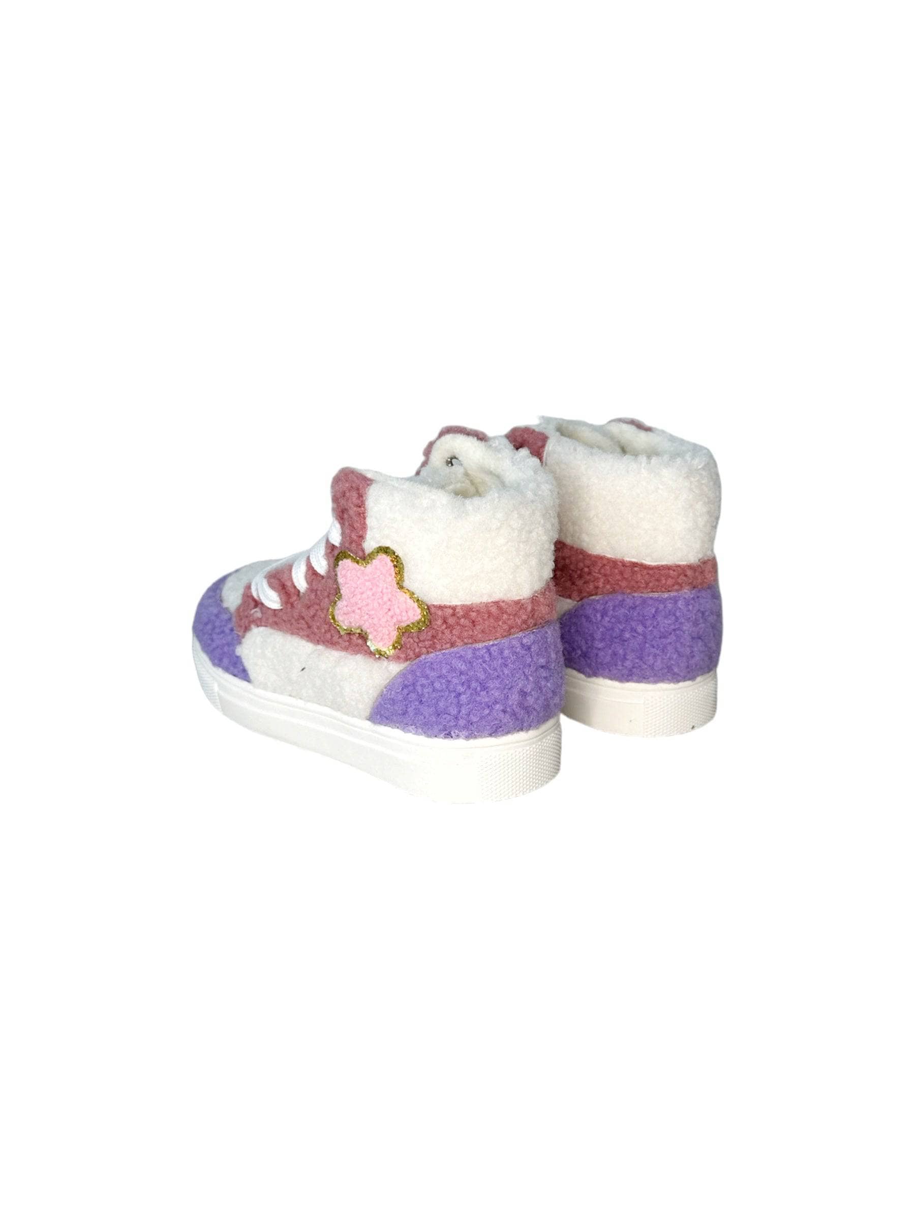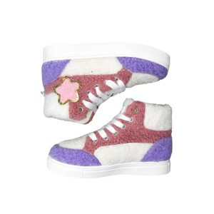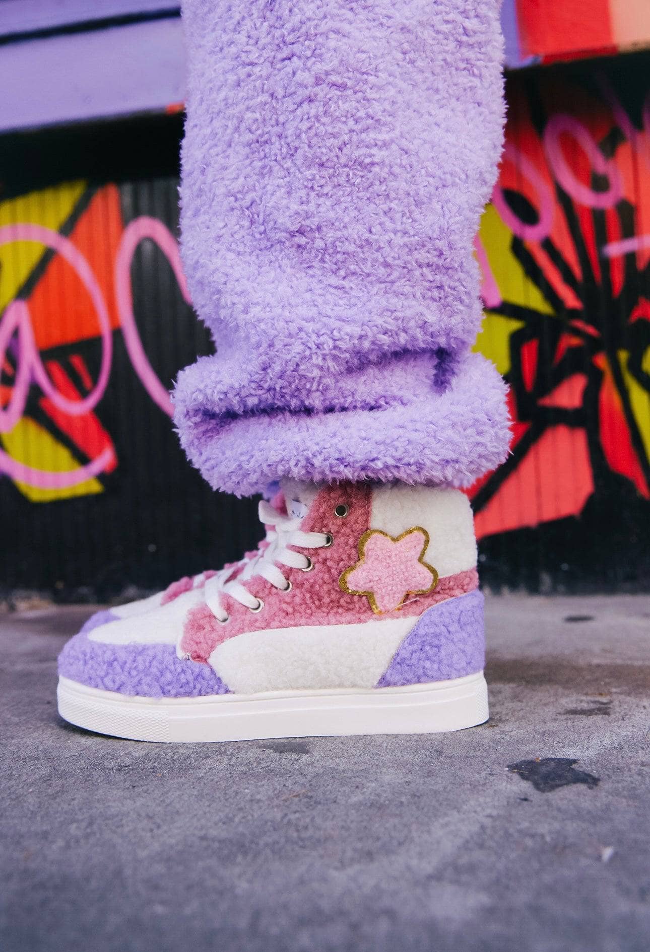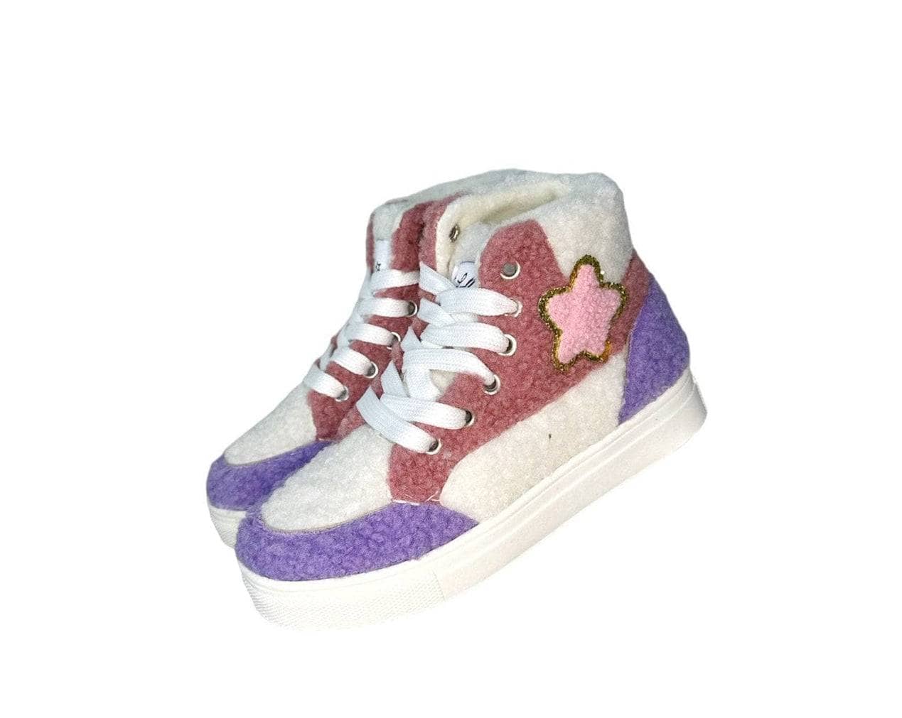 - Embrace whimsical charm with the Pastel Cloud Sherpa High-Top Sneakers, featuring soft pastel hues and a playful star embellishment.