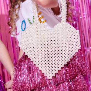 - Heart-shaped mini purse crafted from shimmering pearl beads.