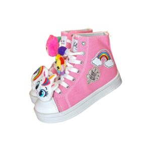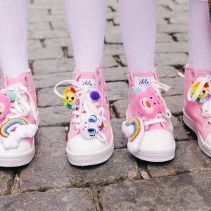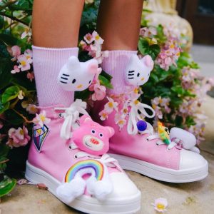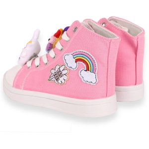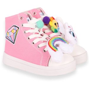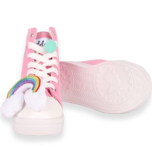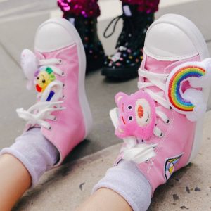 - Adorable pink high-top sneakers featuring playful rainbow and cloud patches with surprise plushie accents on the laces.