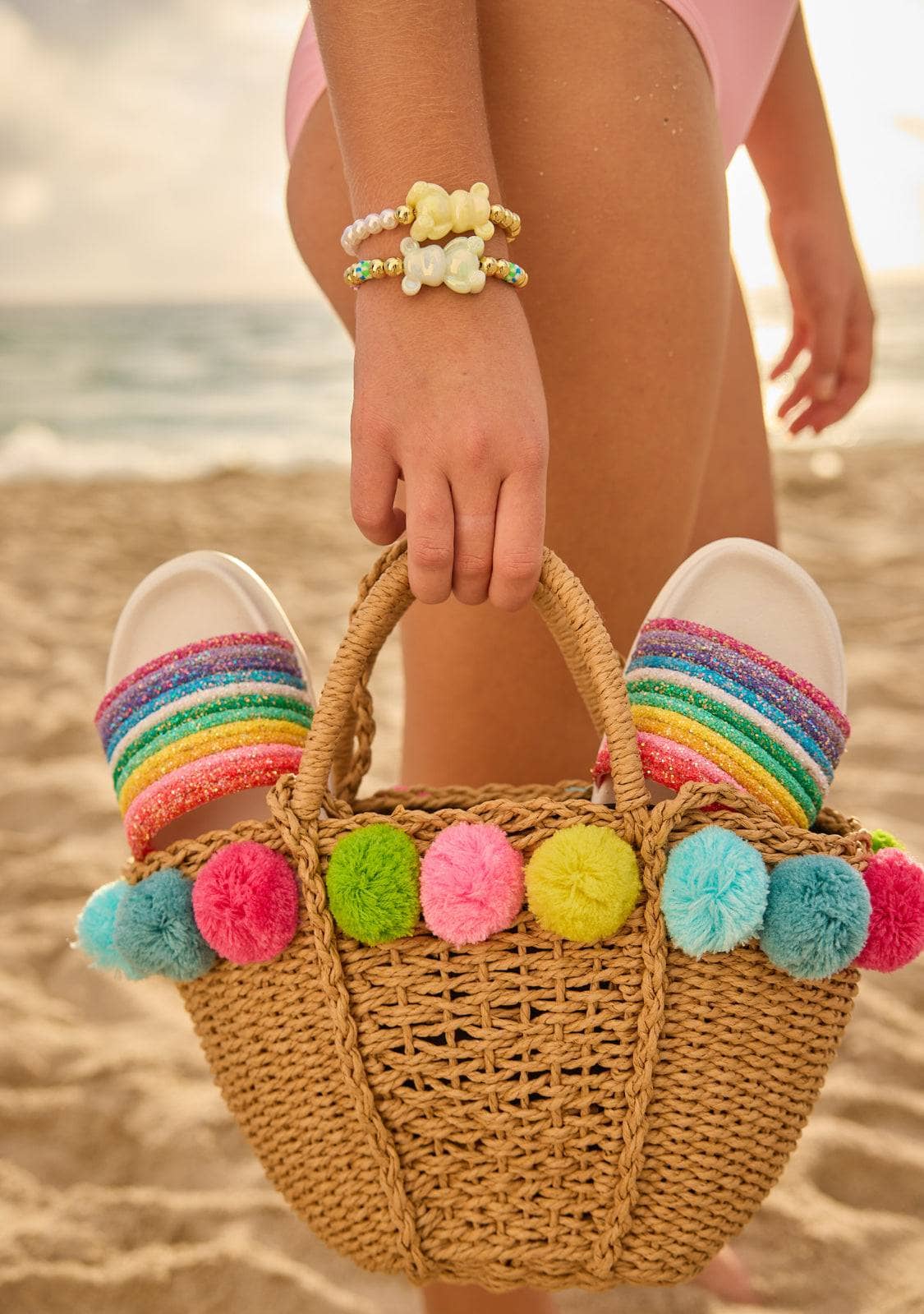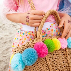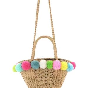 - Fabric: High-quality woven straw with pom-pom embellishments.