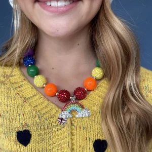 - Vibrant necklace featuring colorful gum-ball beads paired with a sparkling rainbow crystal pendant for a playful yet dazzling look