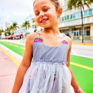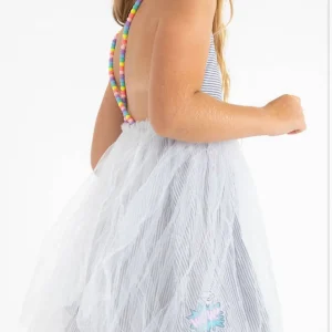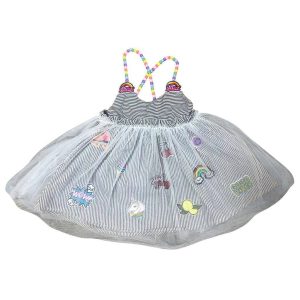 - Adorable dress featuring a striped bodice and a tulle skirt adorned with fun and colorful candy-themed patches, perfect for sweetening up any day.