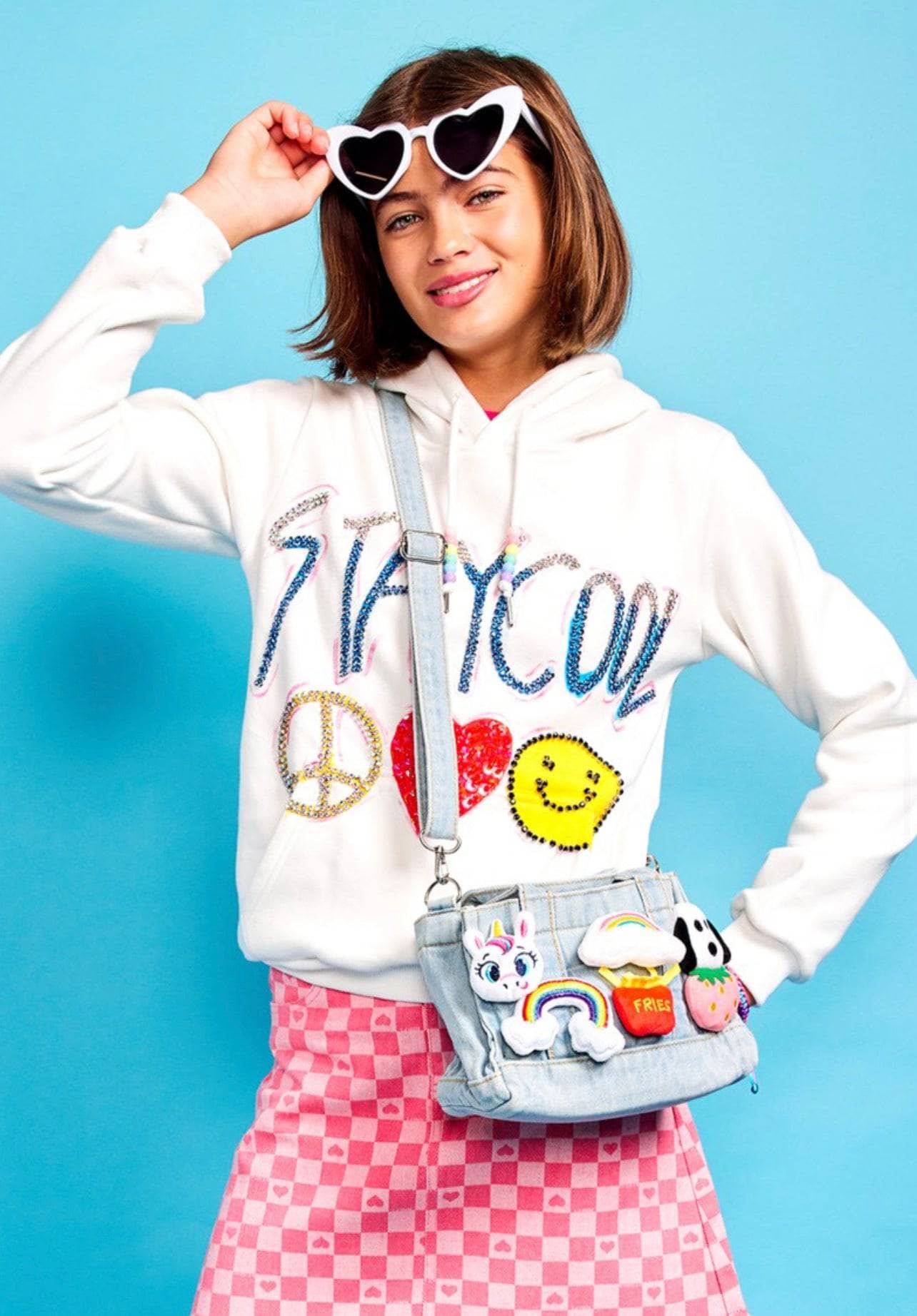 - This unique denim purse is adorned with playful plushie patches, including a unicorn, rainbow, cloud, puppy, fries, and a strawberry.