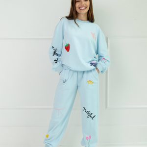 - Relaxed-fit sweatshirt and jogger pants with colorful embroidered icons all around